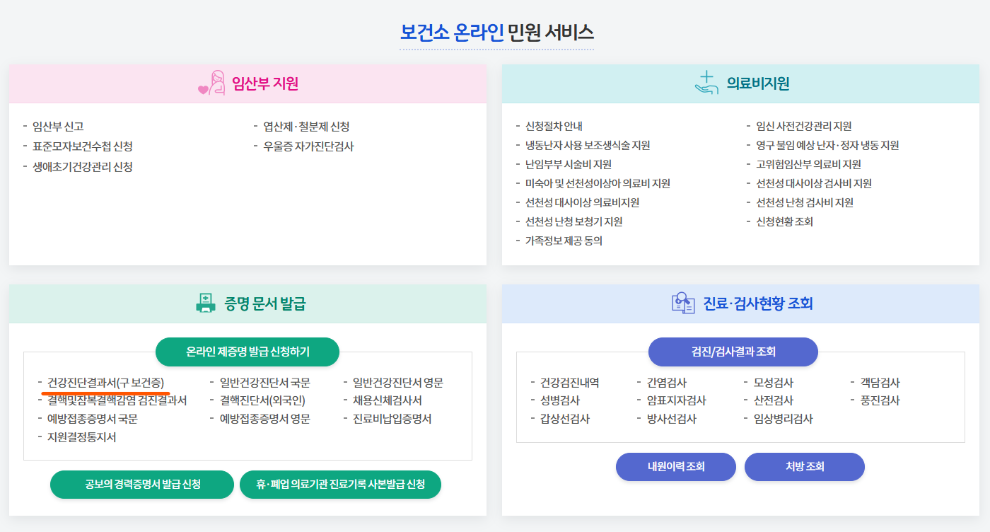 홈페이지에서 ‘건강진단결과서(보건증) 발급’ 메뉴를 선택합니다.