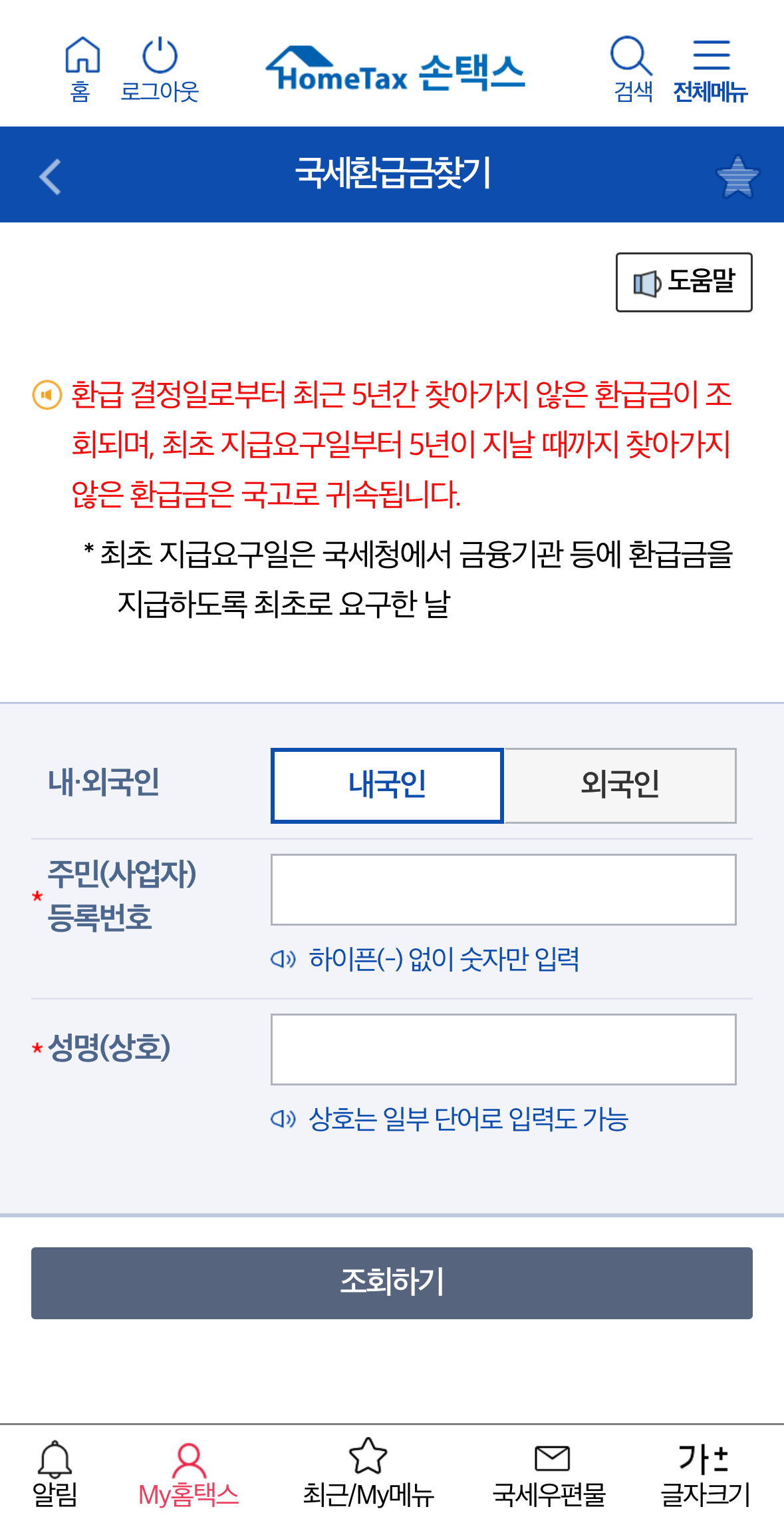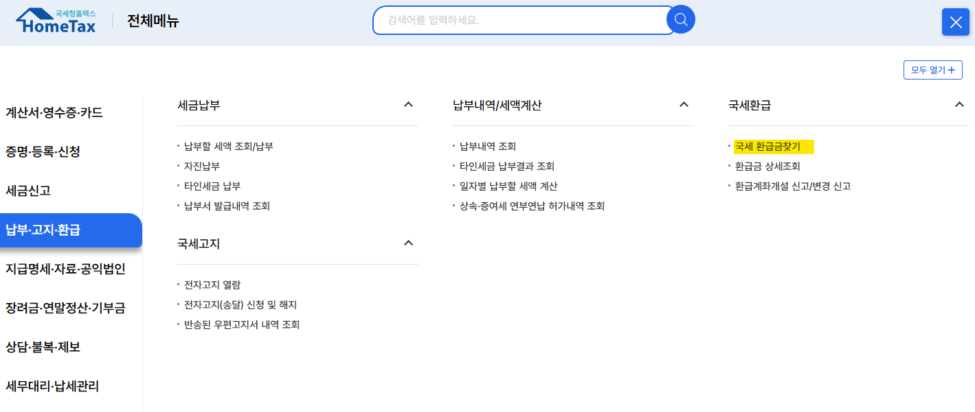 손택스를 설치하셨다면 마찬가지로 로그인을 한 후, 전체메뉴에서 납부/고지/환급-국세 환급금찾기 들어가서 정보들을 입력하면 쉽게 확인할 수 있습니다.