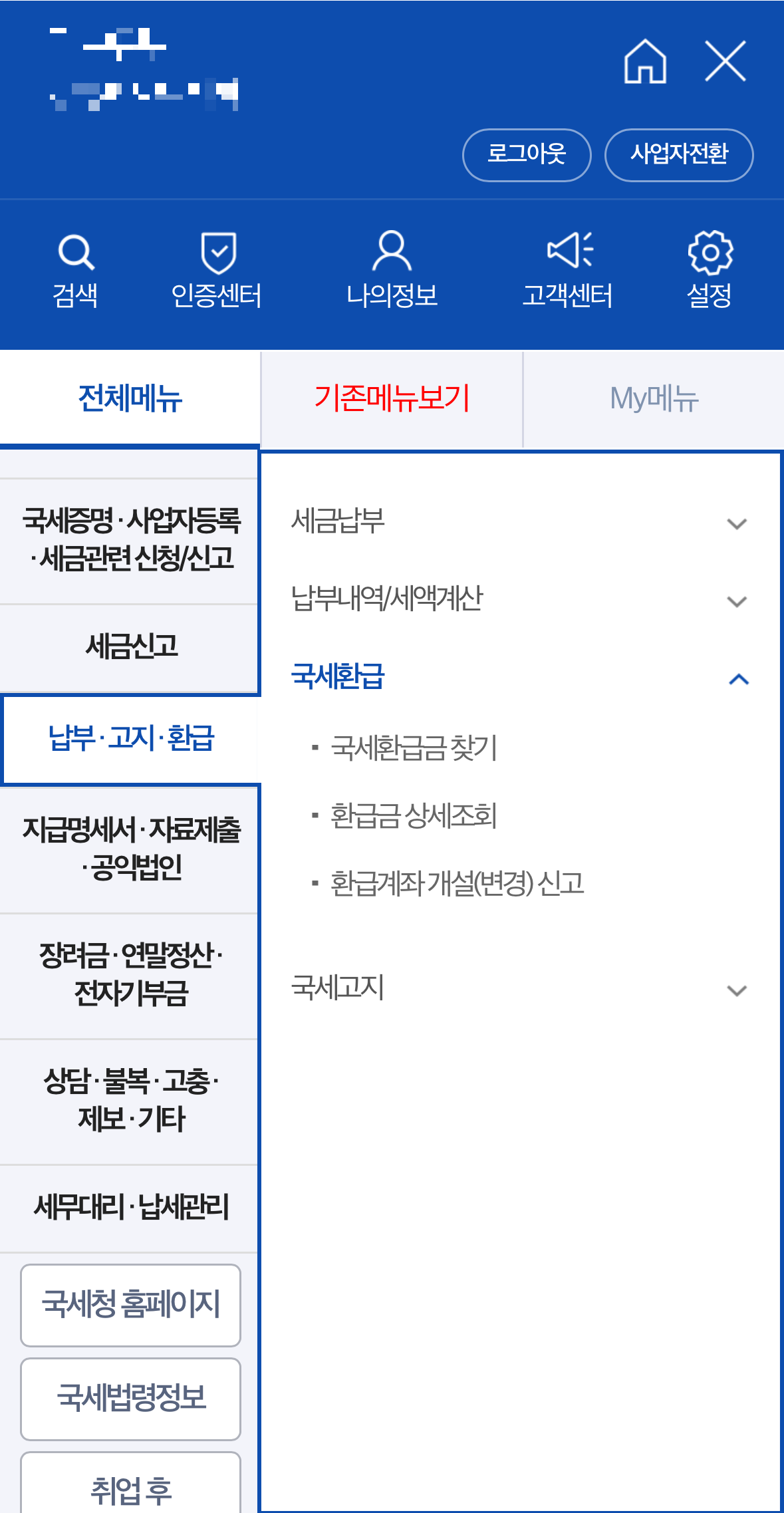 로그인을 했다면 우측 상단에 메뉴를 눌러 납부/고지/환급-국세 환급금찾기를 클릭합니다.
