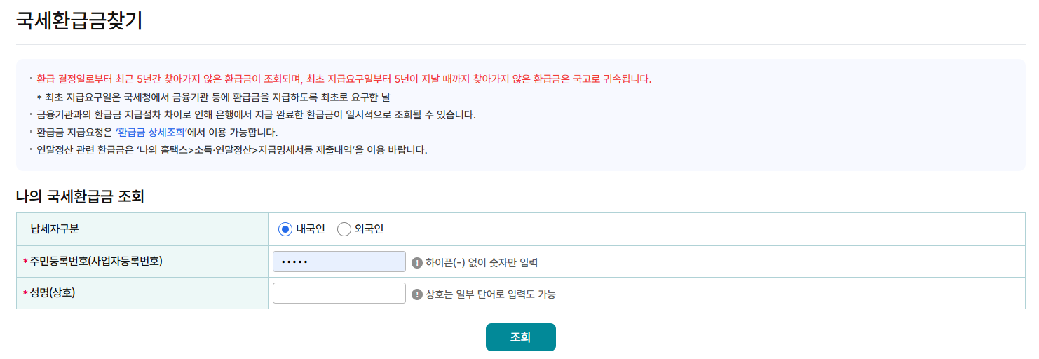 주민등록번호와 이름, 또는 사업자등록번호를 입력하면 환급금이 있는지 바로 확인이 가능합니다.