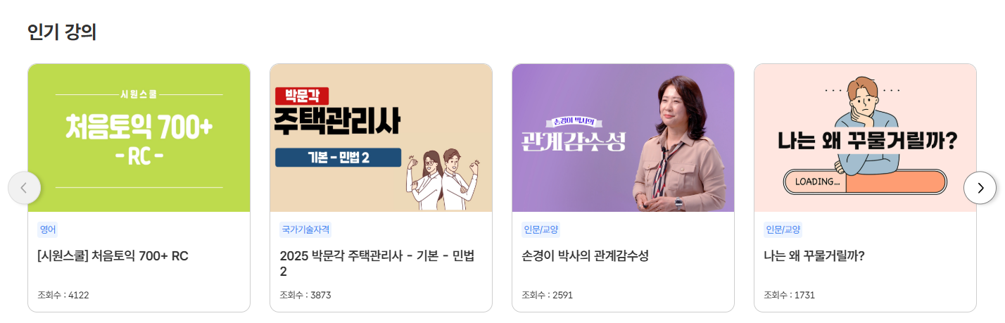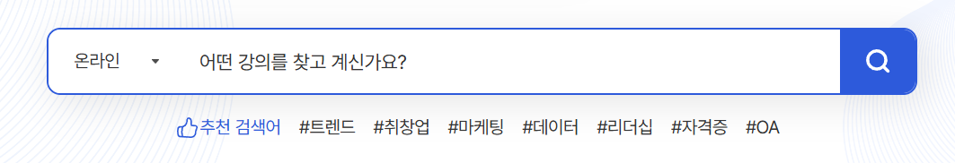 상단 검색창에 원하는 키워드(예: 엑셀, 사회복지사, 영상 편집)를 입력하면 관련 강좌를 확인할 수 있습니다.