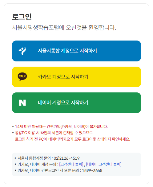 ‘서울시 평생학습포털’을 입력해 접속 후 로그인을 합니다. 비회원도 일부 강좌를 시청할 수 있지만, 수료증 발급과 학습 이력 관리를 위해서는 회원가입이 필요합니다.