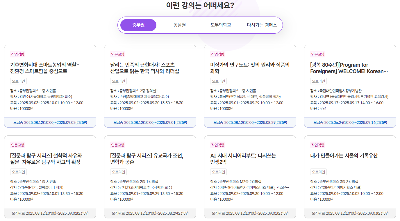 단순히 교양 차원의 강좌가 아니라, 재취업·창업·자격증·디지털 활용 등 실제 생활과 직결되는 내용을 담고 있습니다.