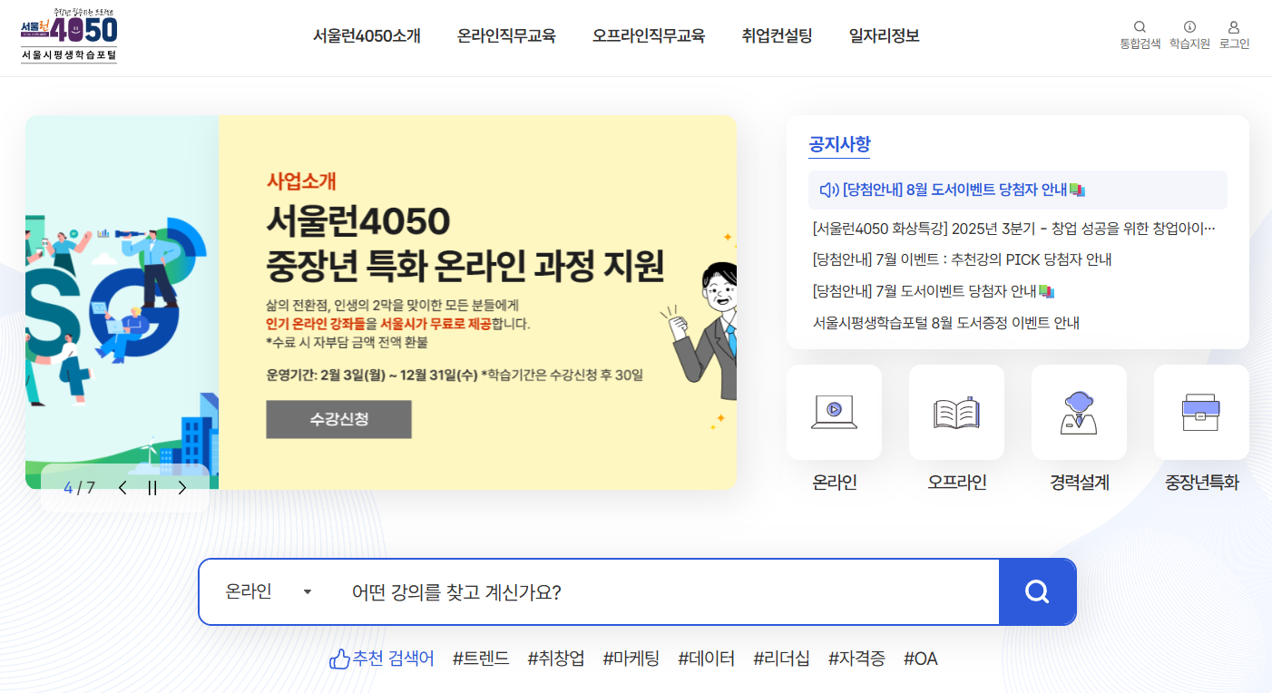 40~50대에게는 새로운 기술과 지식을 다시 익히는 과정이 인생의 전환점이 되곤 합니다. 서울런 4050은 40세~59세 서울시민을 주 대상으로 제공되는 온라인 평생학습을 제공하고 있습니다.