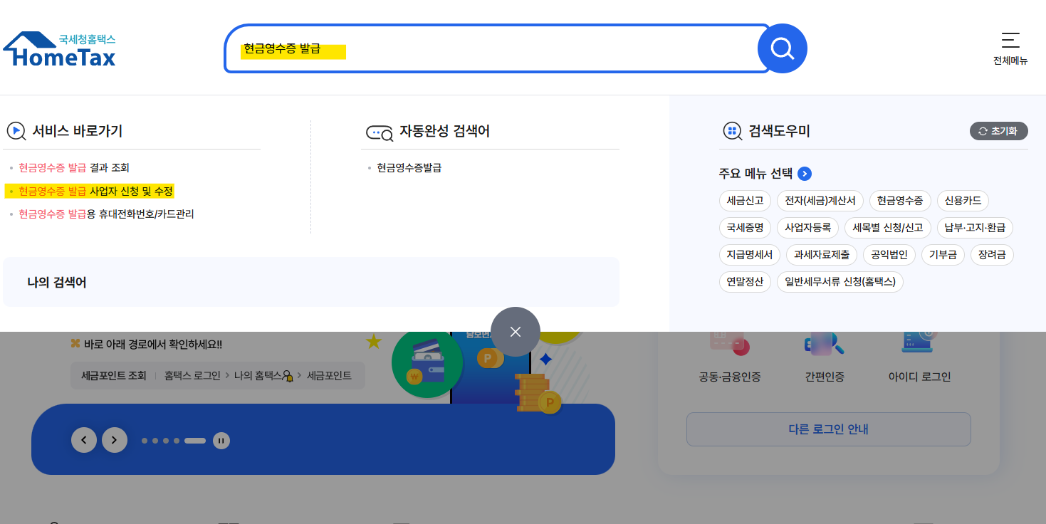 먼저 홈택스를 접속하여 상단 검색창에 '현금영수증 발급'이라고 검색하면 '서비스바로가기->현금수증 발급 사업자 신청 및 수정' 를 클릭하고 로그인을 진행합니다.