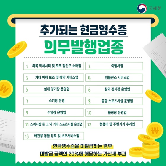 국세청에서는 일정 업종을 현금영수증 의무발행 업종으로 지정하여 현금 거래에 대해 반드시 영수증을 발급하도록 하고 있습니다. 이를 지키지 않을 경우에는 가산세와 같은 불이익이 생길 수 있기 때문에 해당 업종에 포함이 되는지 확인하고 가맹점 등록을 해두는 것은 필수입니다.